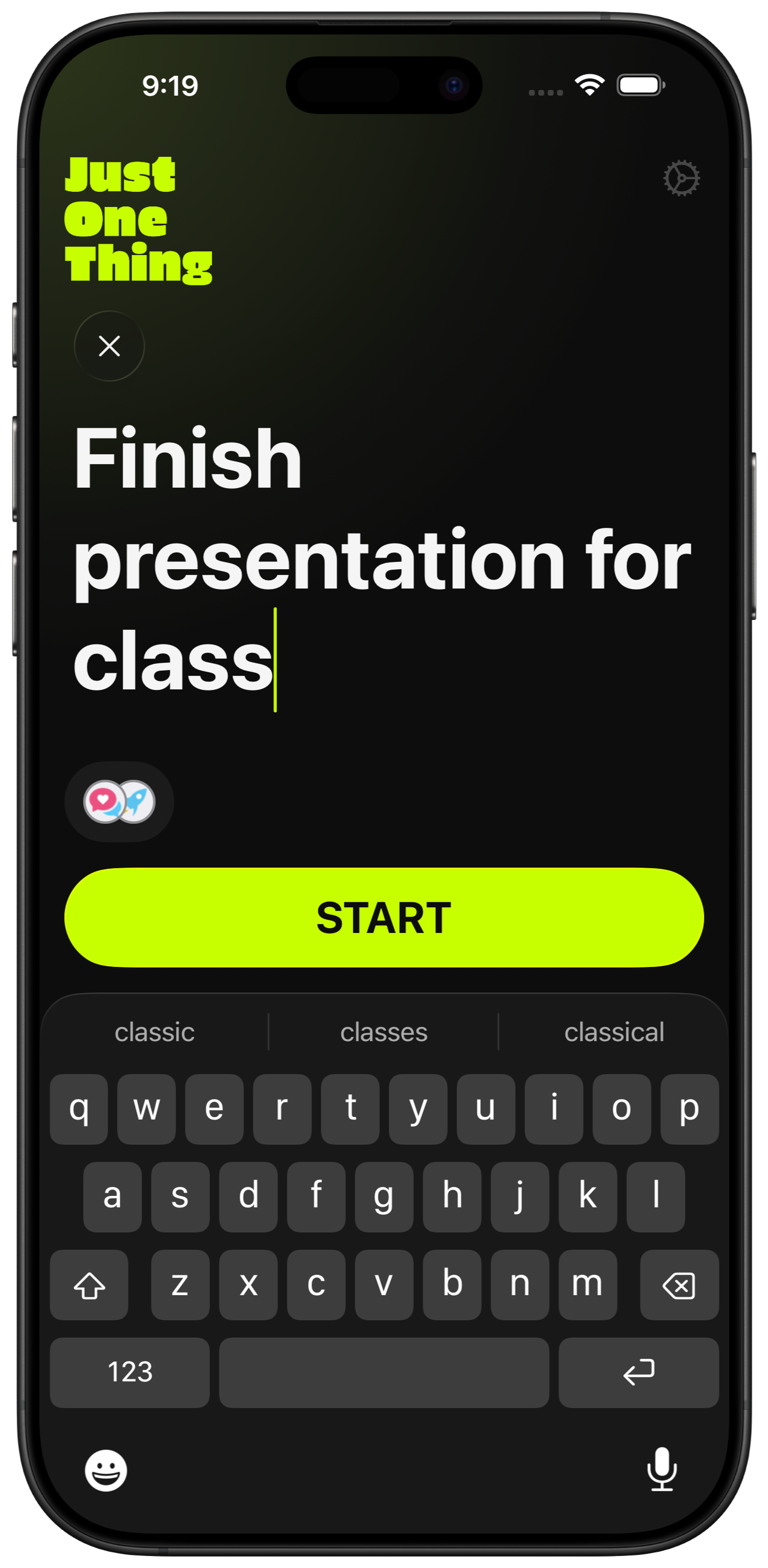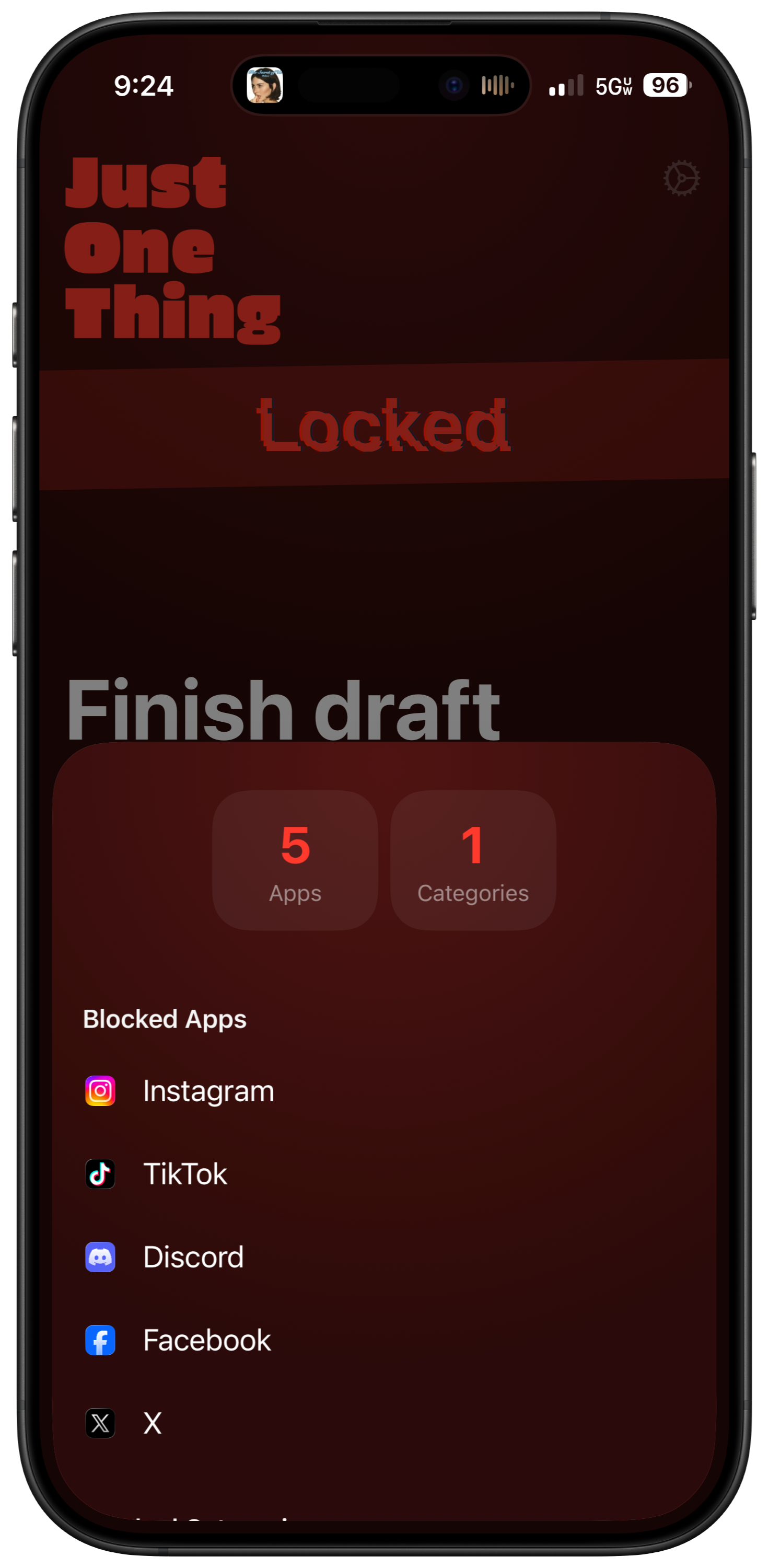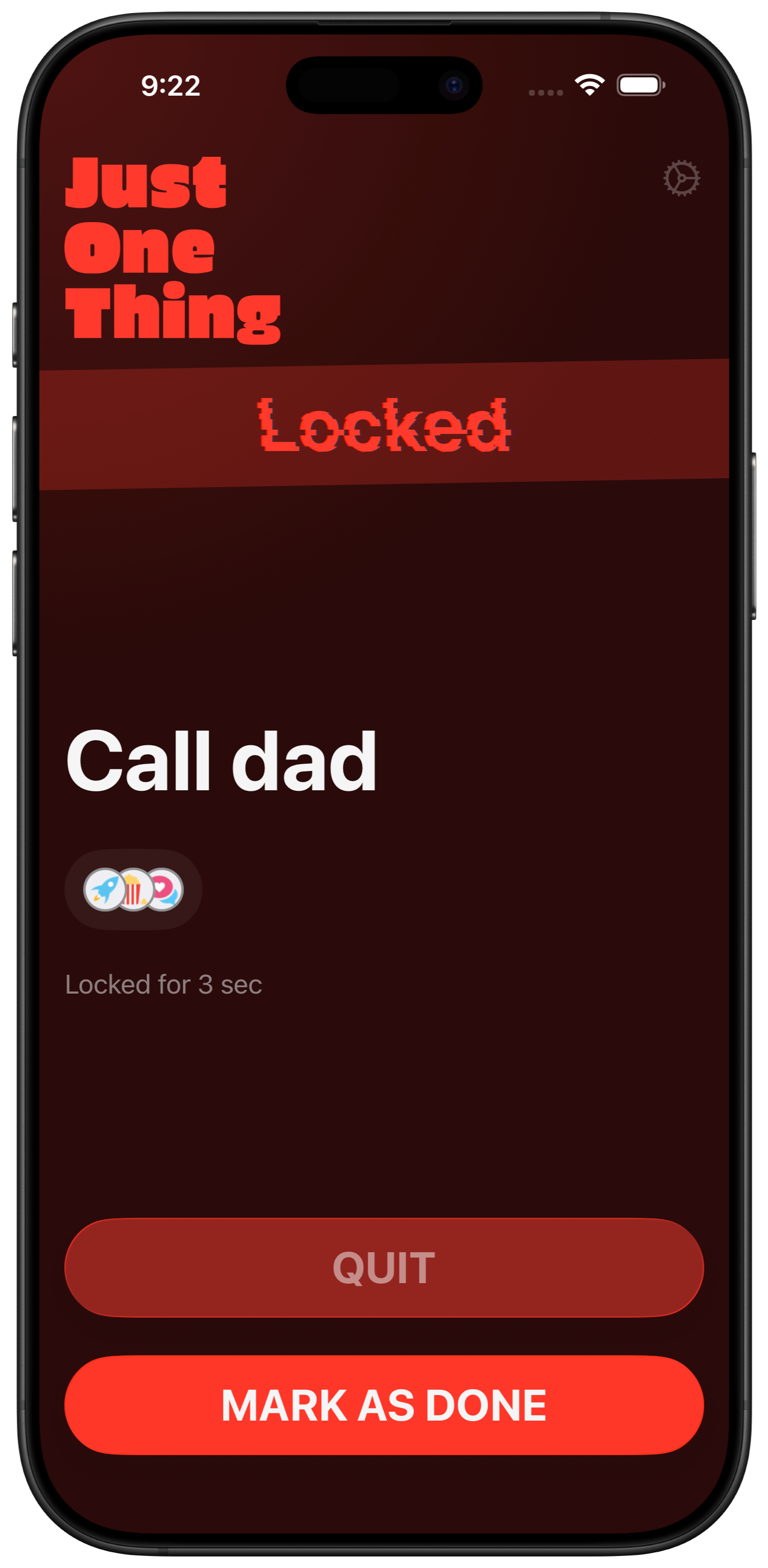 Blocking activates via iOS Screen Time. A lock screen widget shows your active task. Your apps unlock the moment you mark it done.